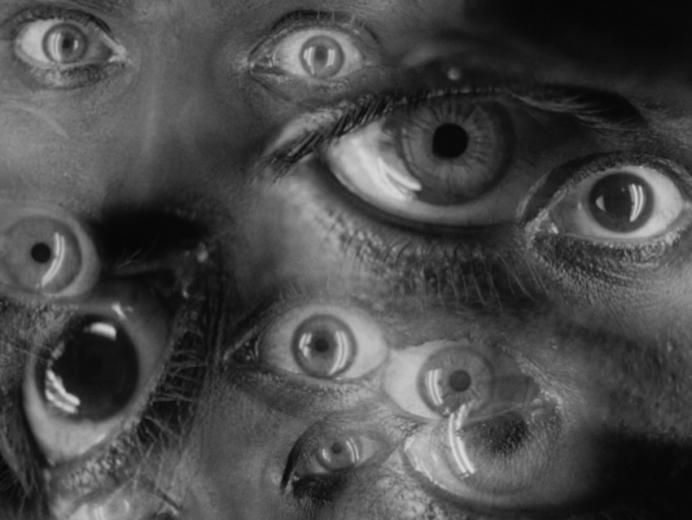 The montage of eyes serves as a portrayal of the different characters in response to Maria’s dance sequence. The stylized editing in this kaleidoscope image calls attention to the eyes of the viewer. But, this seductive dance conveys a message to the men of Metropolis so that they will obey her. The scene suspends the narrative and calls audiences as it serves as an attraction to not only her sexuality but expands social perceptions of the world. According to “In a way, the spectator’s eye (including the extension of the Kino-eye) acts as a barrier between the technological rationality that modernity implants in the viewer and the viewer’s own body and soul. The Kino-eye becomes the mediator, connecting both the dystopian and utopian elements of technology to create Vertov’s “perfect new man” (Vertov).” The use of the Kino-eye serves as a function of self-reflexivity. This thematic element shapes our view of the modern world, but drives us to look back on ourselves. The series of eyes in this sequence creates such a haunting atmosphere that it is able to maintain a terrifying feeling towards the viewer.